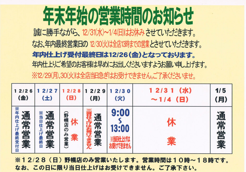 ※12月30日は当日仕上げの急ぎ物は出来ませんのでご了承願います。
